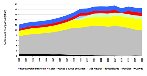 Esta é a evolução dos consumos de energia final, em mega toneladas de petróleo equivalente; quando digo que o consumo de energia de petróleo é de 52,8% é de petróleo, não significa que o resto seja de energia eléctrica; de facto, há mais fontes de energia final, como o gás natural e a biomassa.