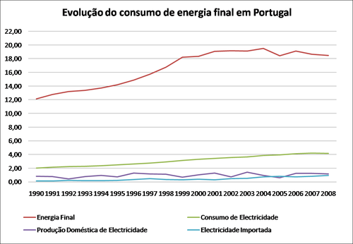Comparados com os nívels de 1990, todos os consumos subiram. Todos menos o da produção de energia eléctrica, dadas as dificuldades de armazenamento e distribuição. Este aumento é previsível porque foi a partir de 1990 que, como todos sabemos, se deu o crescimento mais económico mais recente. Só que há vários tipos de aumento de consumo. Há uns que não são sustentáveis e que até são prejudiciais. É o caso. Produzíamos mais riqueza com a mesma quantidade de energia em 1990 do que agora. As linhas a azul (consumo de energia eléctrica) e a verde (procura de petróleo rodoviário) apenas assinalam a mudança estrutural que ocorreu. Temos agora uma economia de serviços, com muito mais urbanizações e que são exigentes em termos de energia eléctrica e em que a deslocação em automóvel particular é o paradigma.